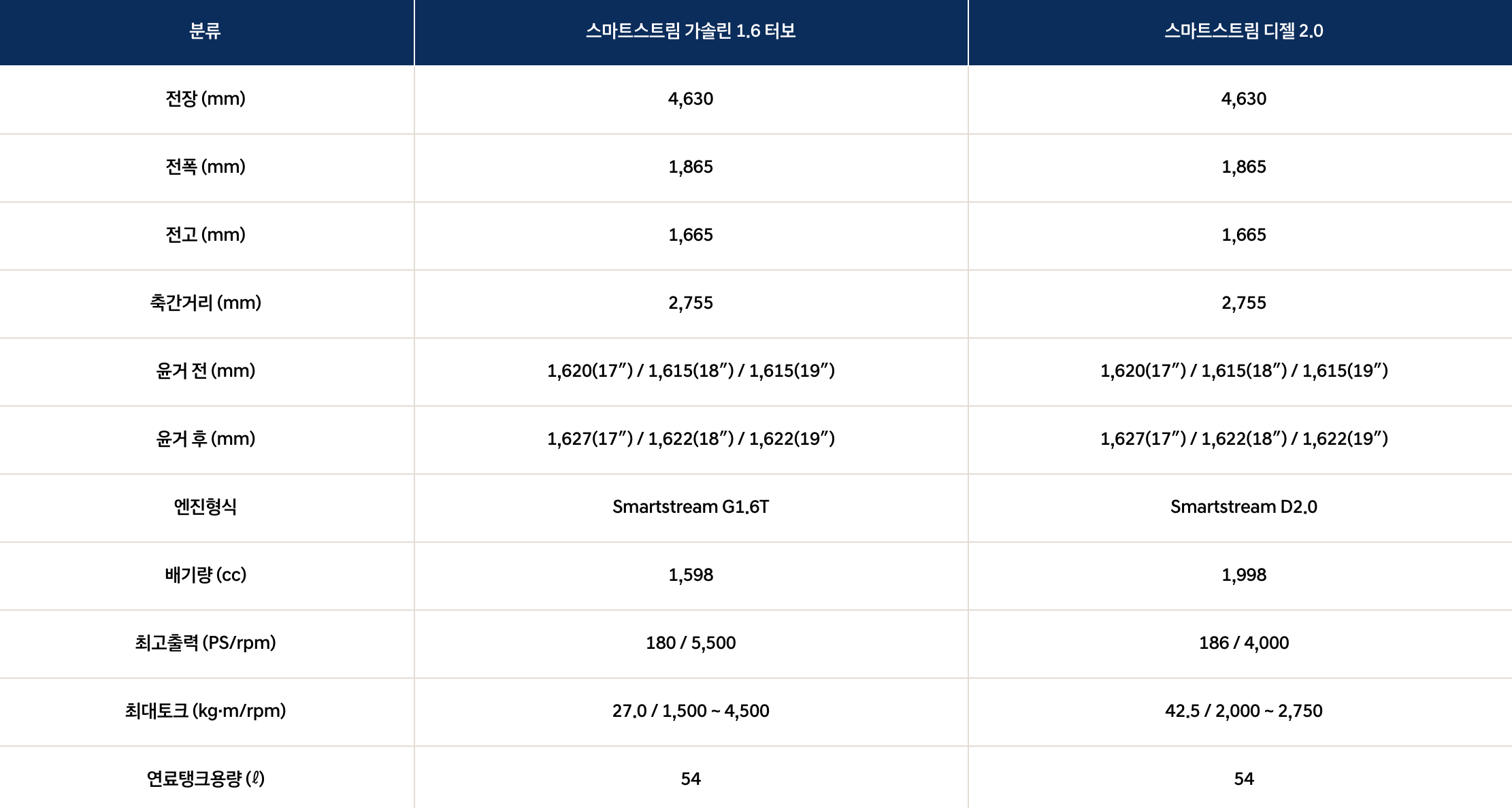 투싼의 엔진은 2.0 디젤 엔진과, 가솔린 1.6 터보 엔진으로 나뉩니다. 2.0 디젤 엔진 같은 경우에는 최고 출력 186ps/4,000rpm, 최대 토크 42.5kg.m/2,000 ~ 2,750rpm 의 힘을 내고, 1.6 터보엔진 같은 경우에는 최고 출력 180ps/5,500rpm, 최대 토크 27.0kg.m/1,500 ~ 4,500rpm 의 힘을 냅니다.