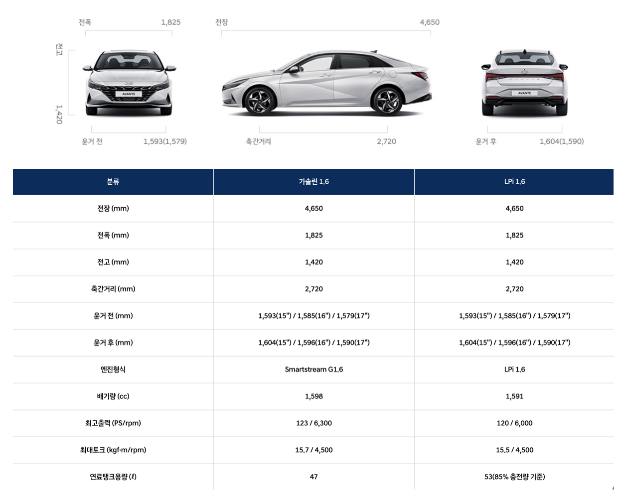 2020 신형 풀 체인지 아반떼는 스마트스트림 가솔린 1.6 엔진을 사용하고 있고, 최고출력 123 (PS/6,300rpm),최대토크15.7(kg·m/4,500rpm) 의 힘을 내고, 3세대 플랫폼을 사용하며 높은 연비를 자랑합니다. 민첩한 핸들링과 안정적인 승차감을 느낄 수 있을 것 같습니다.